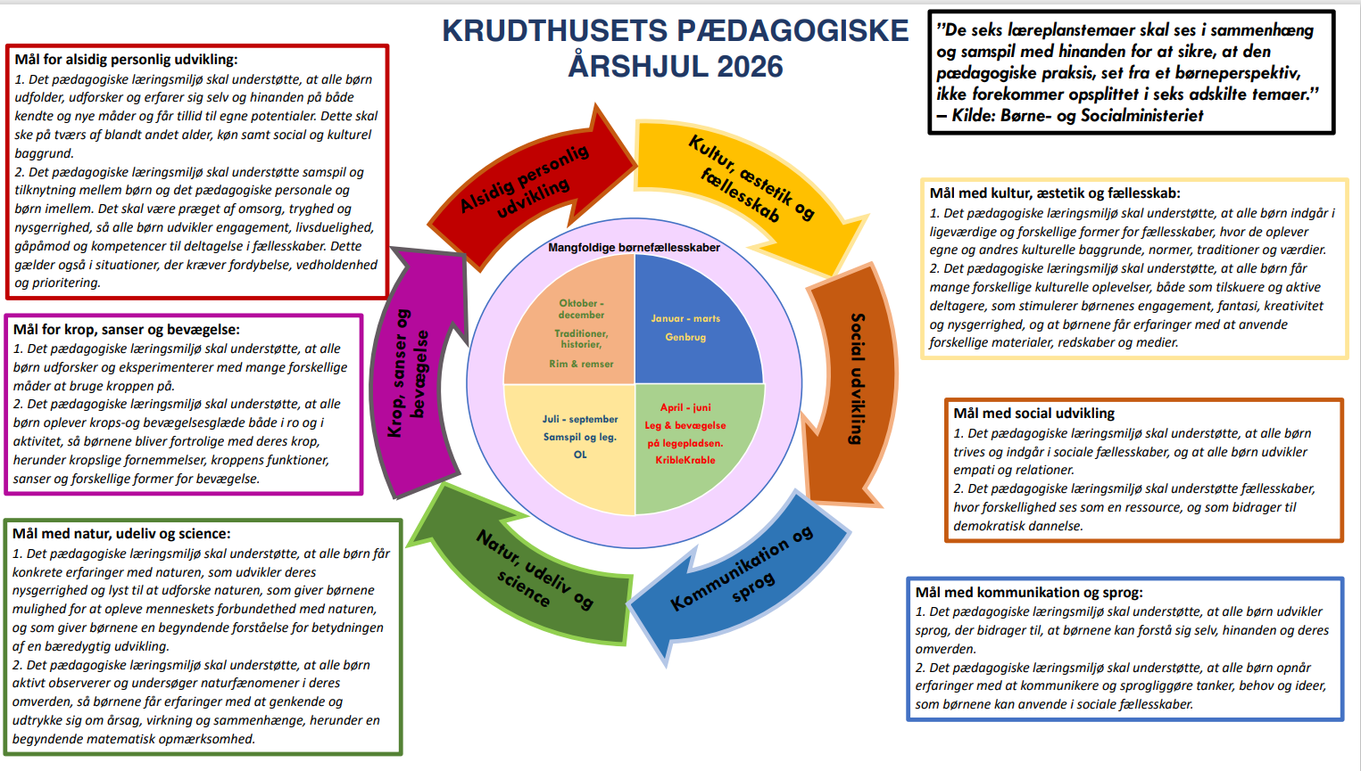 Vores årshjul er det der skaber en fælles ramme for vores pædagogiske planlægning i huset. Under hvert kvartal arbejder vi med et fælles tema som skal kunne ses og mærkes i hele huset. I år er vores overordnet pædagogiske fokus for alle vores temaer MANGEFOLDIGE BØRNEFÆLLESSKABER. Krudthusets pædagogiske årshjul 2026 er vedhæftet dette bilag